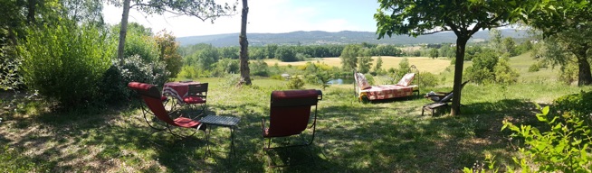 Neben den zu den Wohungen gehörenden Terrassen gibt es zusätzliche Sitz- und Ruheplätze im Schatten von Bäumen auf dem gesamten Gelände verteilt. Hier kann man spektakuläre Sonnenuntergänge über Gordes bewundern oder an einem großen Tisch eigene Freunde und Gäste bewirten. Auf dem parkähnlichen Gelände sind weitere schattige Ruheplätze eingerichtet. Um das Gelände führt ein Weg der sich hervorragend zum Joggen oder Spazieren gehen eignet.